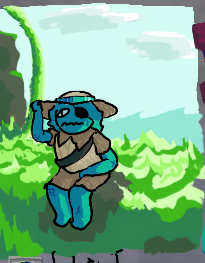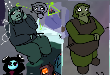aug 9. my favourite: a person standing and then a background drawn after. The orange one is another Lucething, but she's based off of the general vibe of Gaubric fur from that Rimworld dryad mod. And the colour orange. This takes place above the surface of the world SC-4V and company are in.